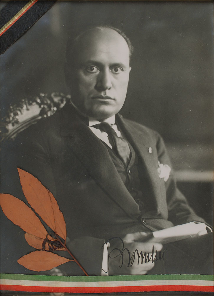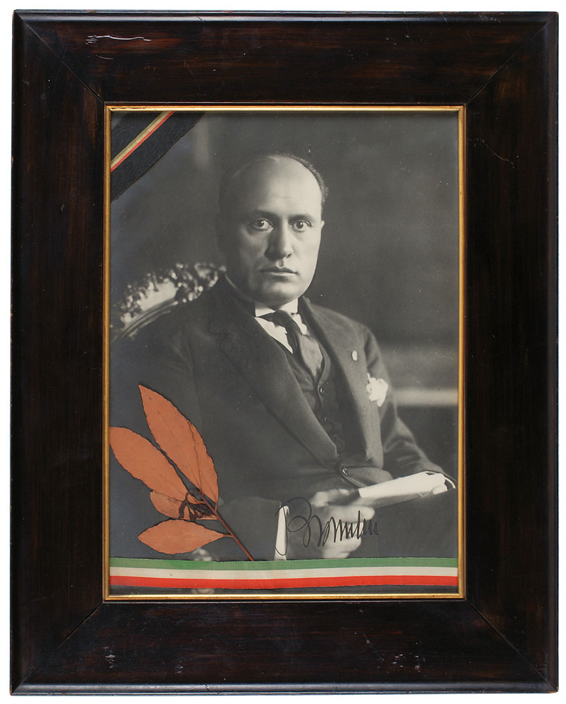 Exceptional vintage matte-finish 9.25 x 13 photo of Mussolini in a three-piece suit, signed in fountain pen. Framed with a pair of official ribbons bearing the colors of Italy and a dried sprig of fig leaves to an overall size of 14.5 x 18.25. In fine condition, with slight silvering to edges. Pre-certified PSA/DNA.