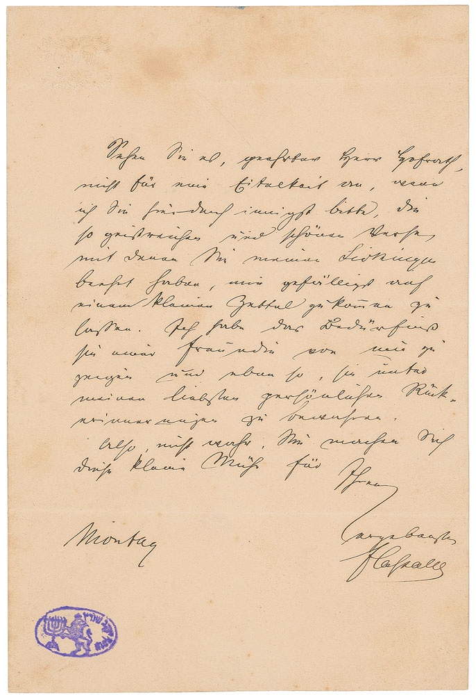German-Jewish jurist, philosopher, and socialist political activist (1825–1864). ALS in German, signed “F. Lassalle,” one page, 5.25 x 8, no date. In part (translated): "Please do not consider it as vanity…if I cordially ask you to send me the spirited and beautiful words you honored my accomplishments with…I have the desire to show a lady friend of mine, and likewise to safely keep it among my dearest personal souvenirs.” In fine condition, with scattered toning. Pre-certified PSA/DNA.