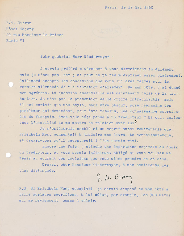 Romanian philosopher and essayist (1911–1995) who was awarded the prestigious Rivarol Prize in 1950 for his first French book, A Short History of Decay. TLS in French, signed “E. M. Cioran,” one page, 8.25 x 10.5, May 12, 1960. Untranslated letter to publisher Max Niedermayer, the founder of the Limes-Verlag, regarding a German edition of his work ‘The Temptation of Existence,’ and some translations done by Friedhelm Kemp. In fine condition, with central horizontal and vertical folds and a pair of punch holes to left edge. Pre-certified PSA/DNA.