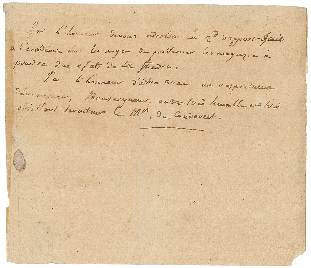 Italian philosopher, mathematician, and early political scientist (1743–1794) who advocated a liberal economy, personal freedoms, and equal rights. ALS in French, signed “M. de Condorcet,” one page, 5.5 x 4.75, no date. In part (translated): "I have the honor to address your 2nd report to the academy on how to preserve shops powder from the effects of lightning." In very good condition, with a central vertical fold, overall toning, show-through from adhesive to the left edge, and a spot to the lower left. Pre-certified PSA/DNA.
