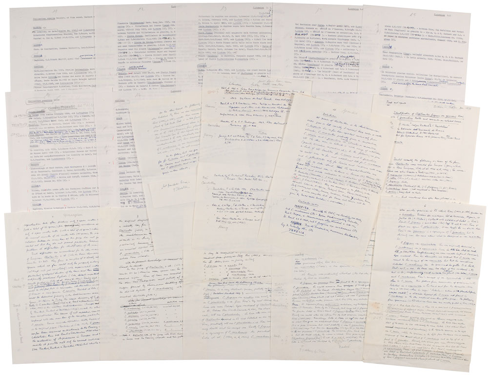 Polish-Swiss chemist (1897–1996) awarded the Nobel Prize in Physiology or Medicine in 1950 for his work on hormones of the adrenal cortex which culminated in the isolation of cortisone. Impressive autograph manuscript, comprised of nine handwritten pages and nine hand-edited typed pages, 8.25 x 11.75, published in the magazine Webbia in December 1978. A draft manuscript by Reichstein entitled “Identification of Cheilanthes frapans var. Gennarii Fiori with C. guanchica Bolle and remarks on related taxa,” signed below for himself and two contributors, “E. Nardi, Helga Rasbach, T. Reichstein.” A complex article on ferns, beginning: “Until recently the following six taxa of the fern genus Cheilanthes were recorded in Europe…The two first mentioned have often been placed in a separate genus (Notholaena) and some experts still prefer to follow this precedent.” Also accompanied by a slip signed by Reichstein. In fine condition, with expected wear for a working draft. Pre-certified PSA/DNA.