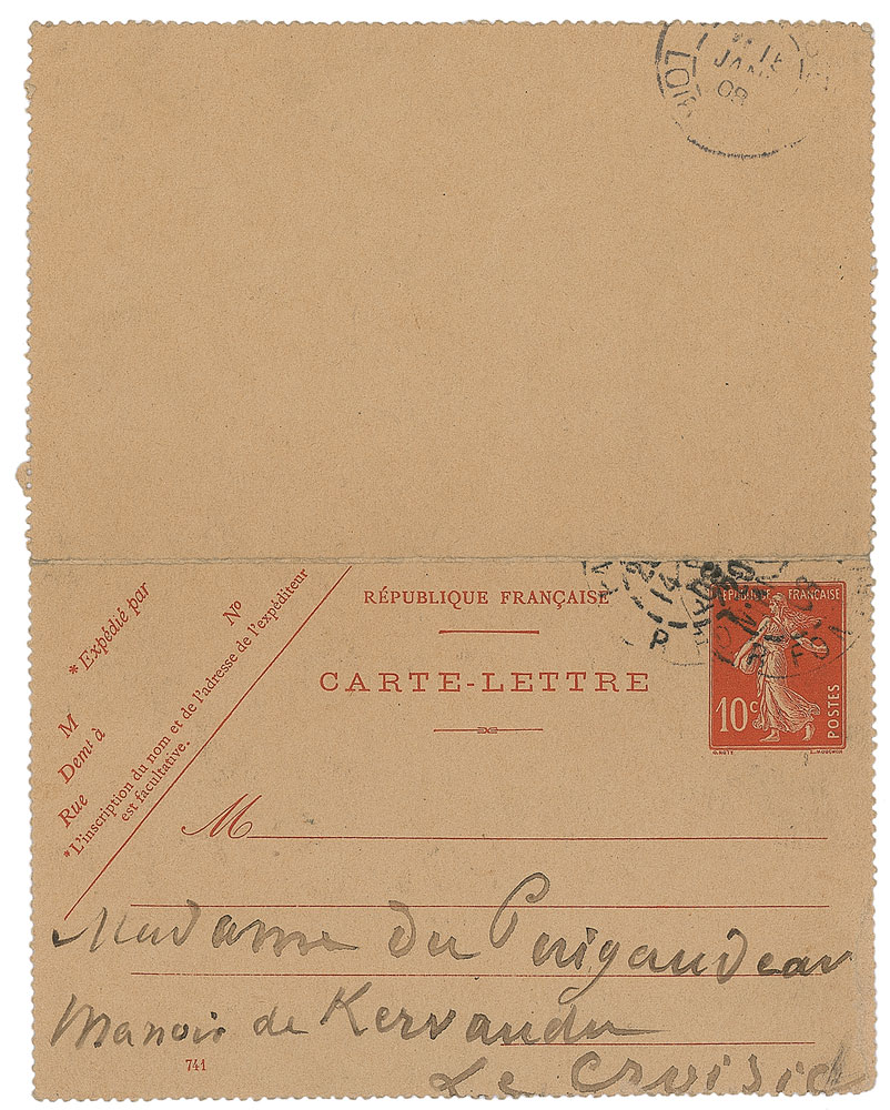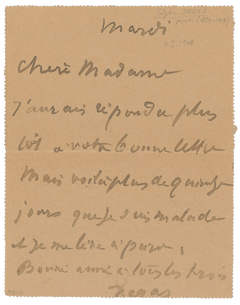 Important French painter and sculptor (1834–1917) regarded as one of the founders of Impressionism. ALS in French, signed “Degas,” one page, 4.25 x 5.5, January 14, 1908. Letter to Madame du Puigaudeau, the wife of painter Ferdinand du Puigaudeau. In full (translated): "I would have answered sooner to your good letter but it's been more than two weeks that I've been sick and I can barely get up. A good year to the three of you.” Addressed on the reverse in Degas’s hand. In fine condition. Ferdinand du Puigaudeau, known for his vibrant portrayals of twilight landscapes, was a close friend of Degas and classed with the post-Impressionists. An excellent association between friends and contemporaries working during these important artistic movements. Pre-certified John Reznikoff/PSA/DNA.