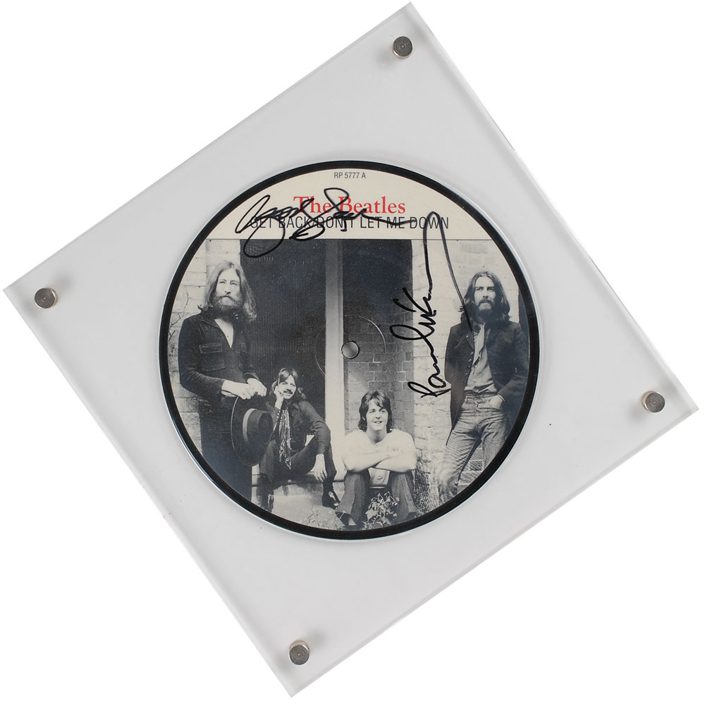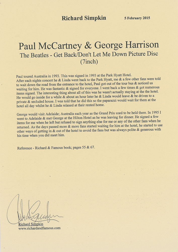 Impressive Get Back/Don’t Let Me Down 7″picture disc album signed on the disc in black felt tip by George Harrison and Paul McCartney. The disc is removably encapsulated in a transparent 9 x 9 presentation holder. In fine condition. Originally obtained by in-person collector Richard Simpkin, and mentioned in his book, Richard & Famous, on pages 55 and 67. Accompanied by a letter of provenance from Simpkin, this record was signed by McCartney when he toured Australia in 1993, and by Harrison when he visited Adelaide for the Grand Prix in 1995. The Richard Simpkin Collection. Pre-certified REAL.