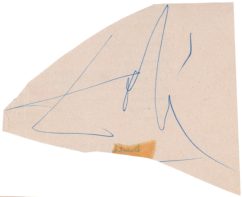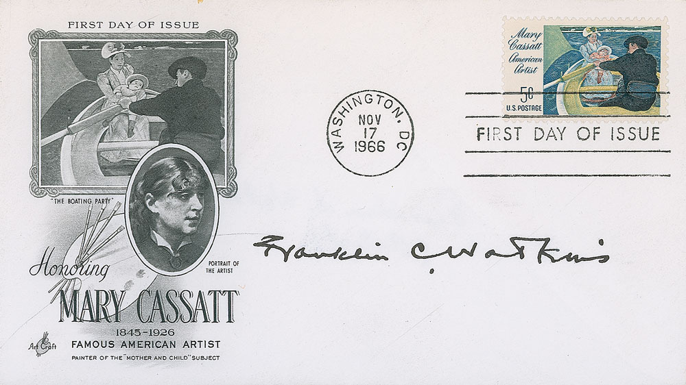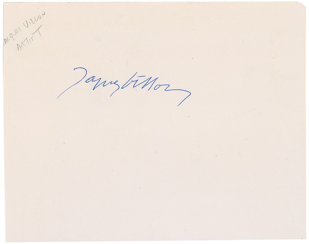 Collection of four items: a ballpoint signature, “Dali,” on an off-white slip clipped from a program; a ballpoint signature, “Jacques Villon,” on an off-white 6.25 x 4.75 slip; an FDC with a cachet honoring Mary Cassatt, signed in black felt tip, “Franklin C. Watkins”; and an FDC with a cachet honoring John Singleton Copley, signed in black ballpoint, “Lee Gatch.” In overall very good to fine condition, with irregularly trimmed edges and an area of discoloration to the Dali. Pre-certified PSA/DNA.