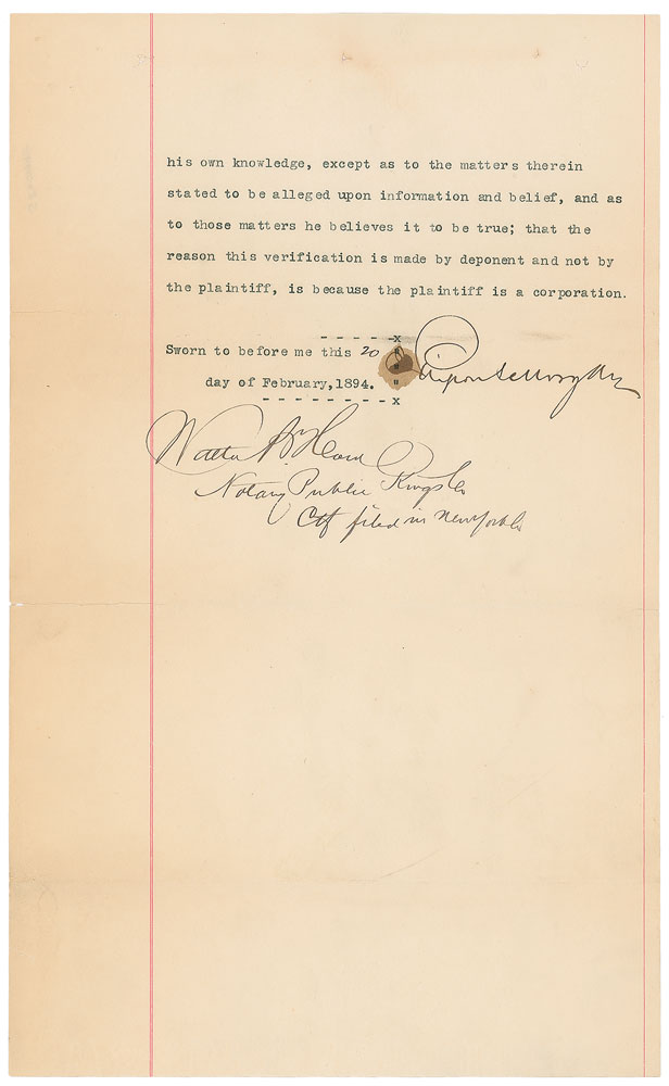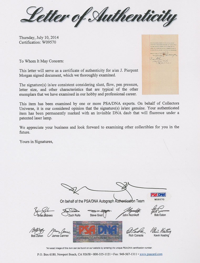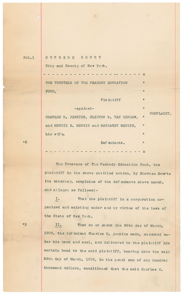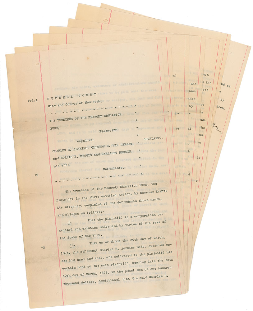 DS, seven pages, 8 x 13, February 20, 1894. Lengthy Supreme Court of New York legal document in which the Trustees of the Peabody Education Fund bring a case against a group of people, led by Charles H. Jenkins, for failing to repay a $100,000 mortgage. Signed at the conclusion by Morgan, serving as treasurer of the Trustees of the Peabody Education Fund, and countersigned by a notary. In fine condition, with expected document wear and a stray ink blot to the first letter of Morgan’s signature. Accompanied by a full letter of authenticity from PSA/DNA. The Peabody Education Fund was established in 1867 to promote education in the South, seeking to aid elementary education by strengthening existing schools, many of which had been crippled by the Civil War. An unusual document demonstrating Morgan’s philanthropic side.