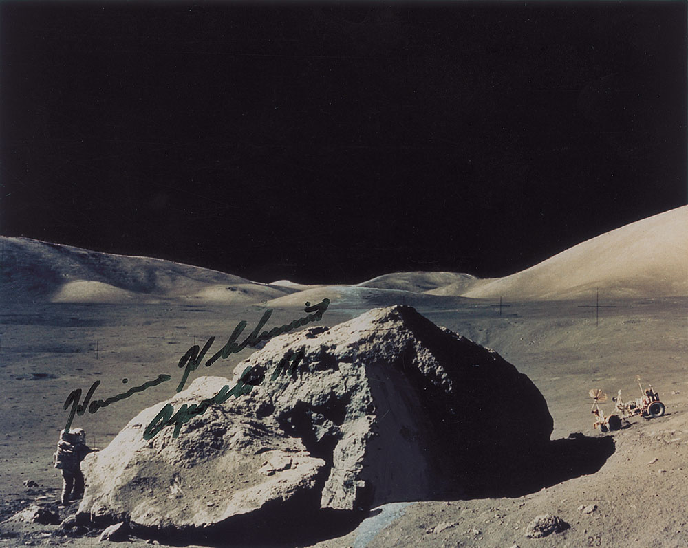 Color satin-finish 10 x 8 photo of the lunar surface, signed in black felt tip, “Harrison H. Schmitt, Apollo 17.” In fine condition, with light contrast to his mission notation. Pre-certified Zarelli Space Authentication.