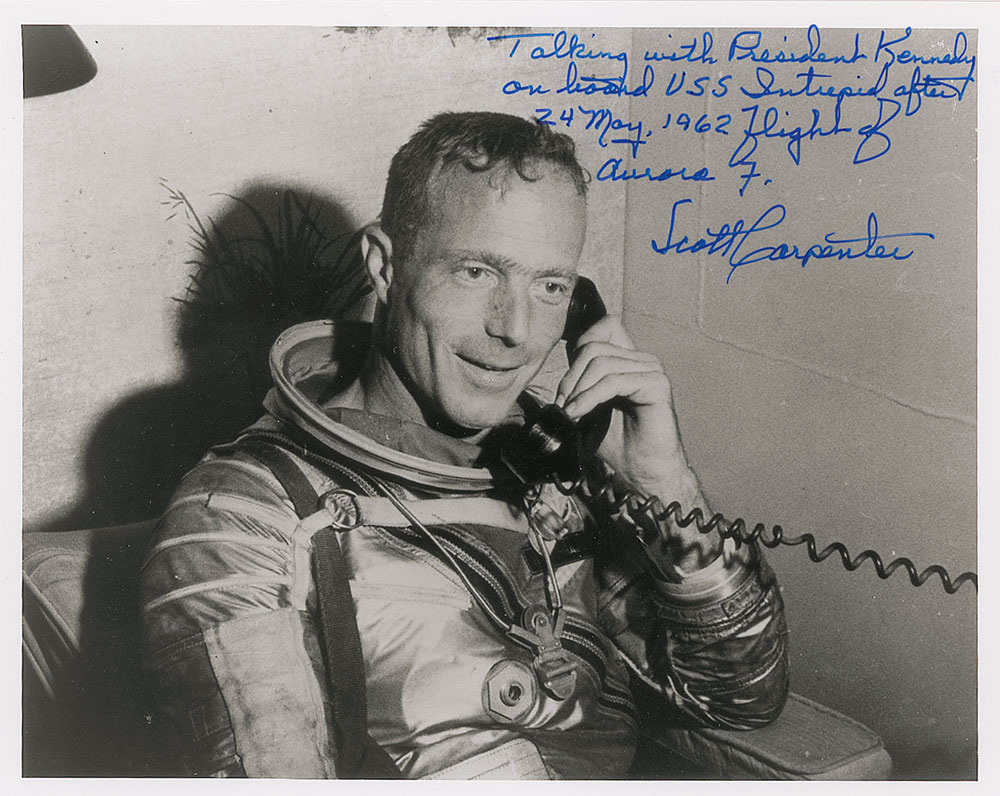 Satin-finish 10 x 8 photo of Carpenter following recovery from his historic mission, signed in blue felt tip, “Talking with President Kennedy on board USS Intrepid after 24 May, 1962 flight of Aurora 7. Scott Carpenter.” In very fine condition. Pre-certified Zarelli Space Authentication.