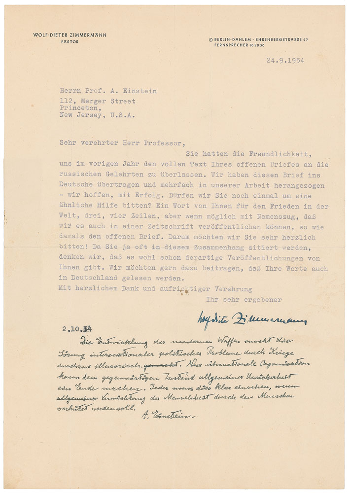 AQS in German, signed “A. Einstein,” dated October 2, 1954, written beneath a TLS sent to him by Pastor Wolf-Dieter Zimmermann, one page, 8.25 x 11.75, personal letterhead, September 24, 1954. Zimmermann wrote to request a comment from Einstein on world peace, in part (translated): “You were kind enough last year to let us have the complete text of your open letter to the Russian scientists...May we impose on you once more with a request for help, a word from you for peace in the world, three, four lines, if possible signed in your own handwriting, so that we can publish it in a magazine, just like you did with your open letter.” Einstein replies below, in full (translated): “The development of modern weapons has rendered the resolution of international political conflicts through warfare completely illusory. Only a supranational organization can put an end to the current state of hysteria. Everyone has to be fully aware of that, if the general annihilation of mankind through man is to be prevented.” In fine condition, with intersecting folds, trivial soiling, and slight show-through to the left edge from a slip affixed to the reverse. An outspoken pacifist since his teen years, Einstein repeatedly encouraged international leaders to strive for one, singular goal: the abolition of war. With the development of the atomic bomb—giving mankind the ability to destroy itself completely—this call grew increasingly urgent and remained at the forefront of Einstein’s thoughts until his death in the spring of 1955. An extraordinarily powerful statement urging the creation of a unified “supranational organization,” to navigate the dangers of living under nuclear threat. Pre-certified John Reznikoff/PSA/DNA.