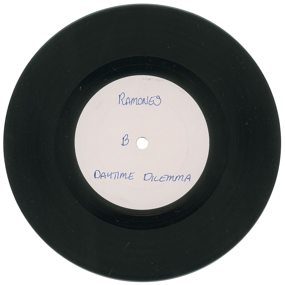 Double-sided 7″ vinyl test pressing of The Ramones’ single album for ‘Bonzo Goes to Bitburg’ and ‘Daytime Dilemma.’ White labels on sides of the disc are hand-notated in blue ballpoint, “Ramones, Bonzo Goes to Bitburg, A, BEG 140” and “Ramones, Daytime Dilemma, B.” In fine condition. Accompanied by the original paper sleeve. Test pressings are the first vinyl discs made at the factory and are produced in small numbers in order to evaluate disc and sound quality prior to mass production. Accompanied by a letter of provenance from Chris Lamy, close friend of The Ramones and guitarist of The Jabbers, formerly GG Allin & The Jabbers. The Chris Lamy Collection.