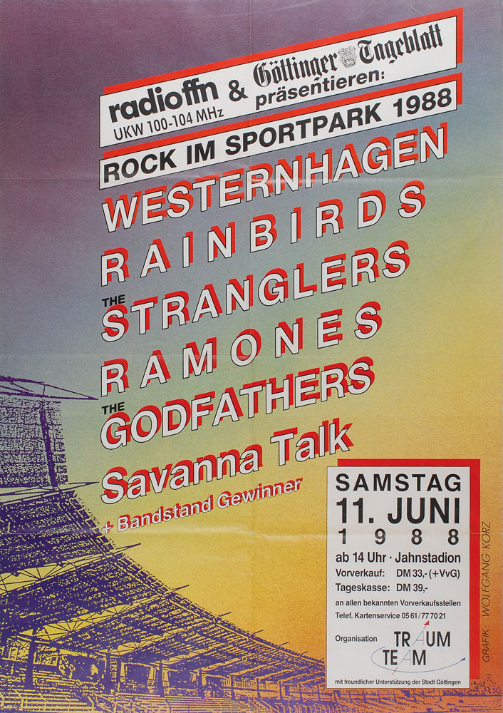 Original color German promotional poster for the Rock IM Sportpark Festival held at Regensburg, Germany’s Jahnstadion on June 11, 1988, 23.25 x 32.75, listing Westernhagen, Rainbirds, The Stranglers, Ramones, The Godfathers, and Savanna Talk as the main performing acts. In fine, folded, and never-before-displayed condition. Accompanied by a letter of provenance from Chris Lamy, close friend of The Ramones and guitarist of The Jabbers, formerly GG Allin & The Jabbers. The Chris Lamy Collection.