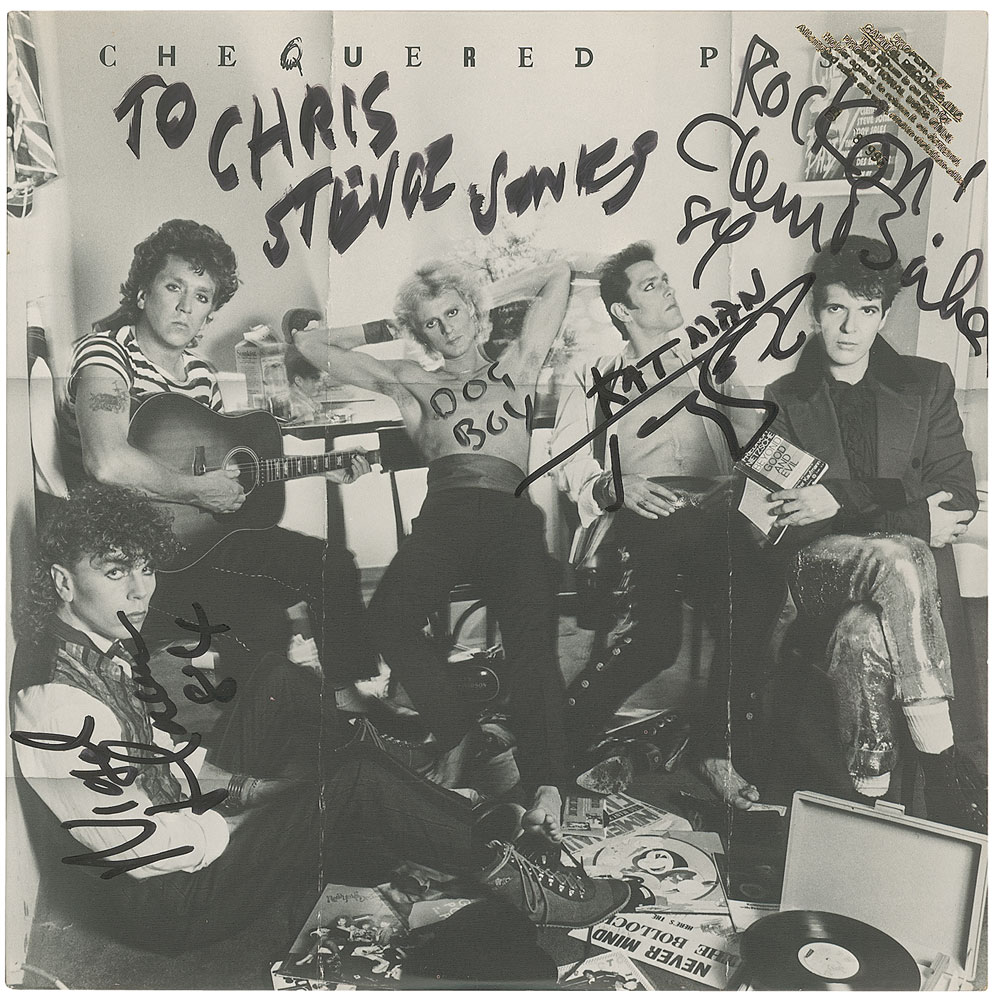 Helmed by English actor-singer Michael Des Barres, Chequered Past was a New York-based rock supergroup that formed in 1982 and featured members of popular acts like Blondie, the Sex Pistols, Iggy Pop, and Detective. Uncommon promotional self-titled debut album from Chequered Past, signed and inscribed on the front cover in black felt tip, “To Chris, Stevie Jones,” “Rock on! Clem Burke, 84,” “Nigel Harrison, 84,” “Kat Man, Tony Sales,” and Michael Des Barres signing as “Dog Boy,” based on a character he portrayed in an episode on Cincinnati’s WKRP radio station. In fine condition. The record is included. Accompanied by a letter of provenance from Chris Lamy, close friend of The Ramones and guitarist of The Jabbers, formerly GG Allin & The Jabbers. The Chris Lamy Collection. Pre-certified REAL.