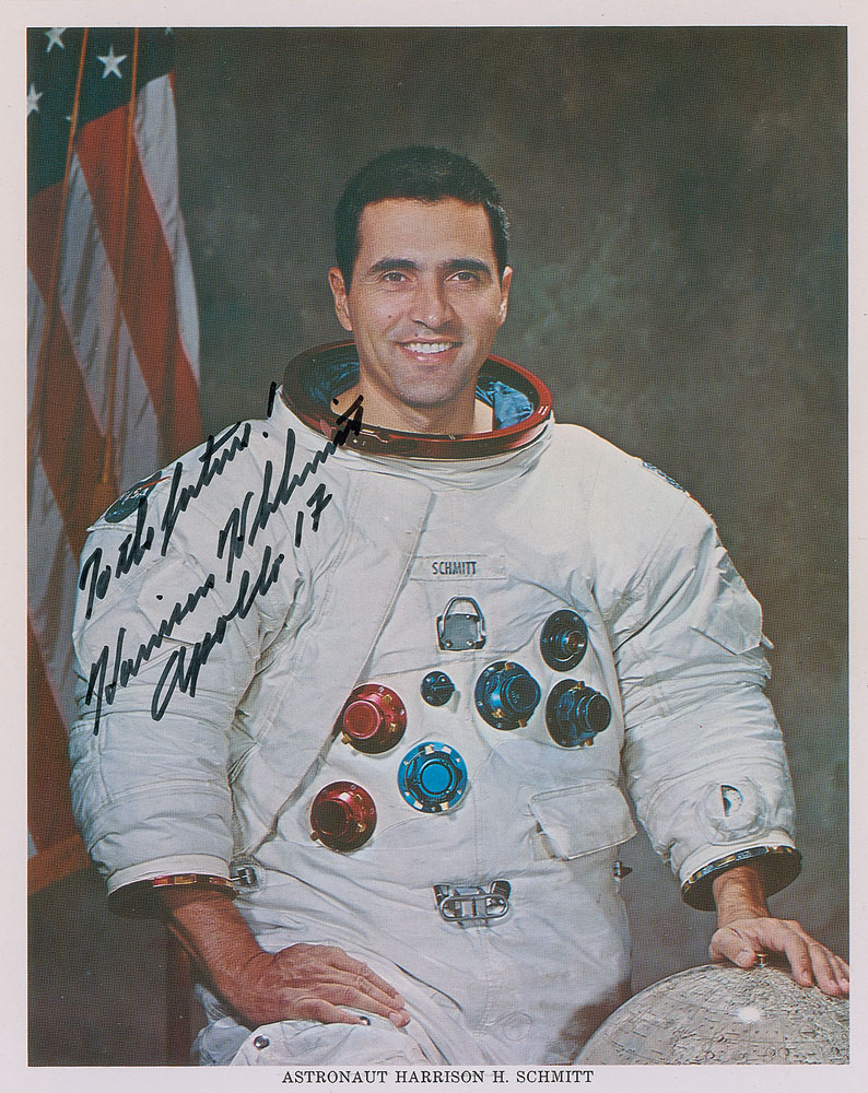 Official color 8 x 10 NASA lithograph of Schmitt in his white spacesuit, boldly signed in black felt tip, “To the future! Harrison H. Schmitt, Apollo 17.” In fine condition. Pre-certified Zarelli Space Authentication.