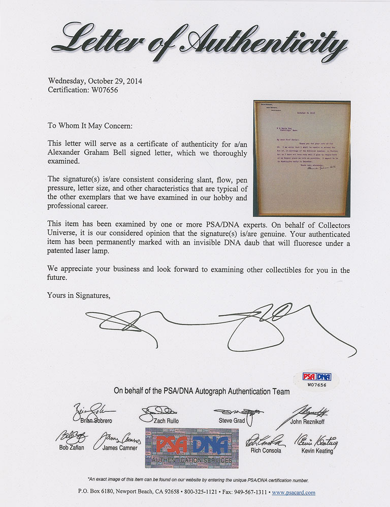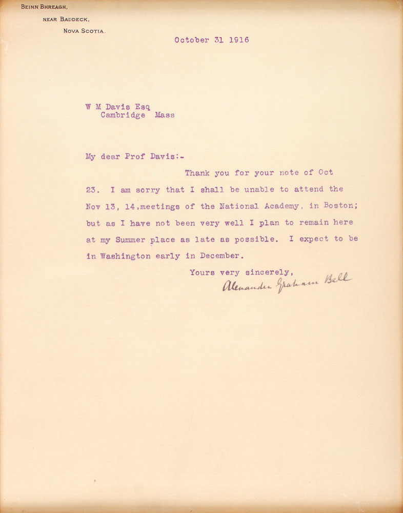 TLS, one page, 8 x 10, personal Beinn Bhreagh letterhead, October 31, 1916. Letter to Professor W. M. Davis in Cambridge, presumably noted Harvard geographer and geologist William Morris Davis. In part: “I am sorry that I shall not be able to attend the Nov 13, 14, meetings of the National Academy, in Boston; but as I have not been very well I plan to remain here at my Summer place as late as possible.” Gorgeously suede-matted and framed with an image and engraved plaque to an overall size of 24 x 20. In fine condition, with uniform toning. Accompanied by a full letter of authenticity from PSA/DNA. Beinn Bhreagh was Bell’s estate in Nova Scotia that he established after making his telephone fortune. He constructed a laboratory and boatyard on the premises where he conducted experiments in powered flight and hydrofoil technology.