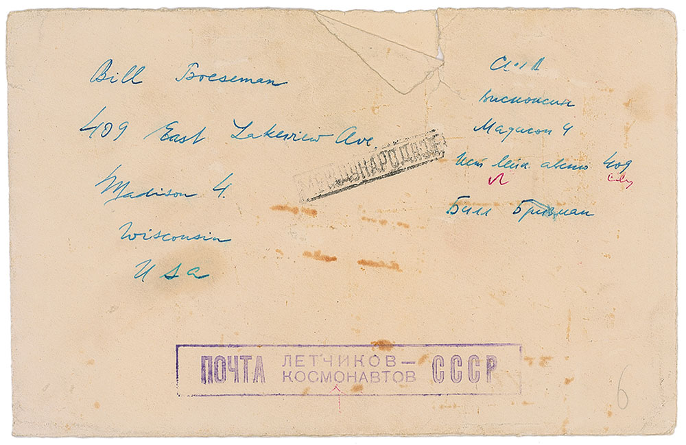 Desirable matte-finish 3.75 x 4.75 head-and-shoulders photo of Gagarin in uniform, signed vertically in blue ballpoint. In fine condition, with trimmed edges. Accompanied by the original mailing envelope. Pre-certified Zarelli Space Authentication.