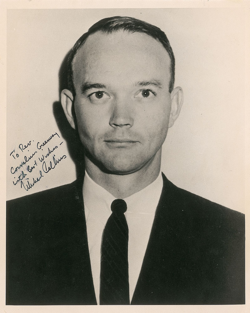 Matte-finish 8 x 10 head–and–shoulders photo of Collins, signed and inscribed in black felt tip, “To Rev. Cornelius Greenway, with best wishes—Michael Collins.” Stamped on the reverse by Wide World Photos. Brushing to the inscription and signature, and light scattered creases, otherwise fine condition. Pre-certified Zarelli Space Authentication.