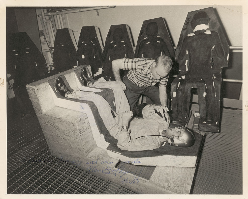 Matte-finish 10 x 8 photo of Shepard seated in a contoured mock-up of the Freedom 7 flight chair, signed and inscribed in blue ballpoint, “To Cornelius Greenway, with warm regards, Alan Shepard, 3/27/61.” Stamped on the reverse by Wide World Photos. In fine condition, with light contrast to portions of the signature and inscription against the busy background, tape remnants to edges, and a crease to upper right corner. Pre-certified Zarelli Space Authentication.