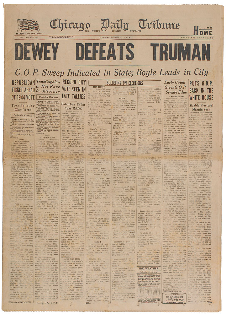Rare complete issue of the Chicago Daily Tribune of November 3, 1948, 17 x 24, featuring the iconic banner headline "Dewey Defeats Truman.” In fine condition, with a few small tears and wear to the spine, a repaired tear to the upper left, and an unobtrusive area of paper loss to the top edge. When the decision to print this paper was made, returns were coming in very slowly and time was running out before the deadline for the edition. The Tribune staff, based on the early returns, decided Dewey would be the next President. After the newspaper was delivered to the street, more returns came in and showed that Truman would in fact be reelected. The already delivered ‘error’ newspapers were gathered for return by staff members sent out to pick them up from newsstands and homes in the Chicago area. Original, entirely complete editions of this newspaper are becoming increasingly scarce. Pre-certified PSA/DNA.