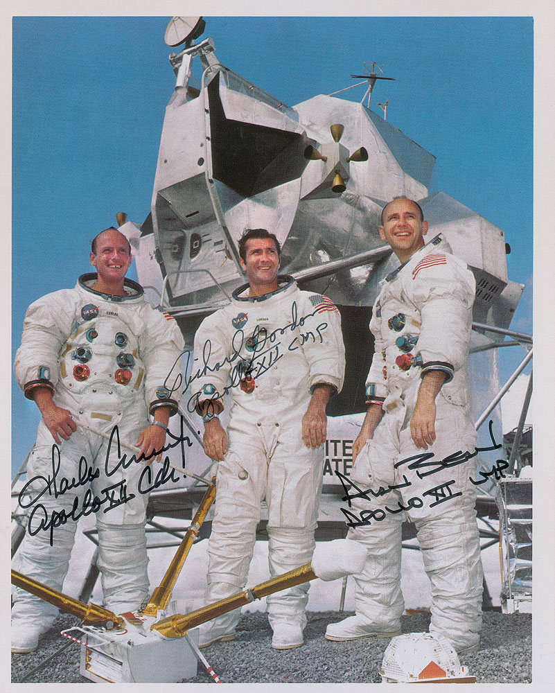 Official color 8 x 10 NASA lithograph of the Apollo 12 crew posing in their white space suits in front of the lunar command module, signed in black felt tip, “Charles Conrad, Apollo XII Cdr,” “Richard Gordon, Apollo XII CMP,” and “Alan Bean, Apollo XII LMP.” In fine condition. Pre-certified Zarelli Space Authentication.