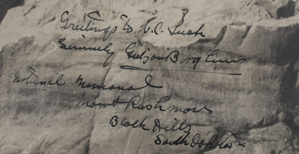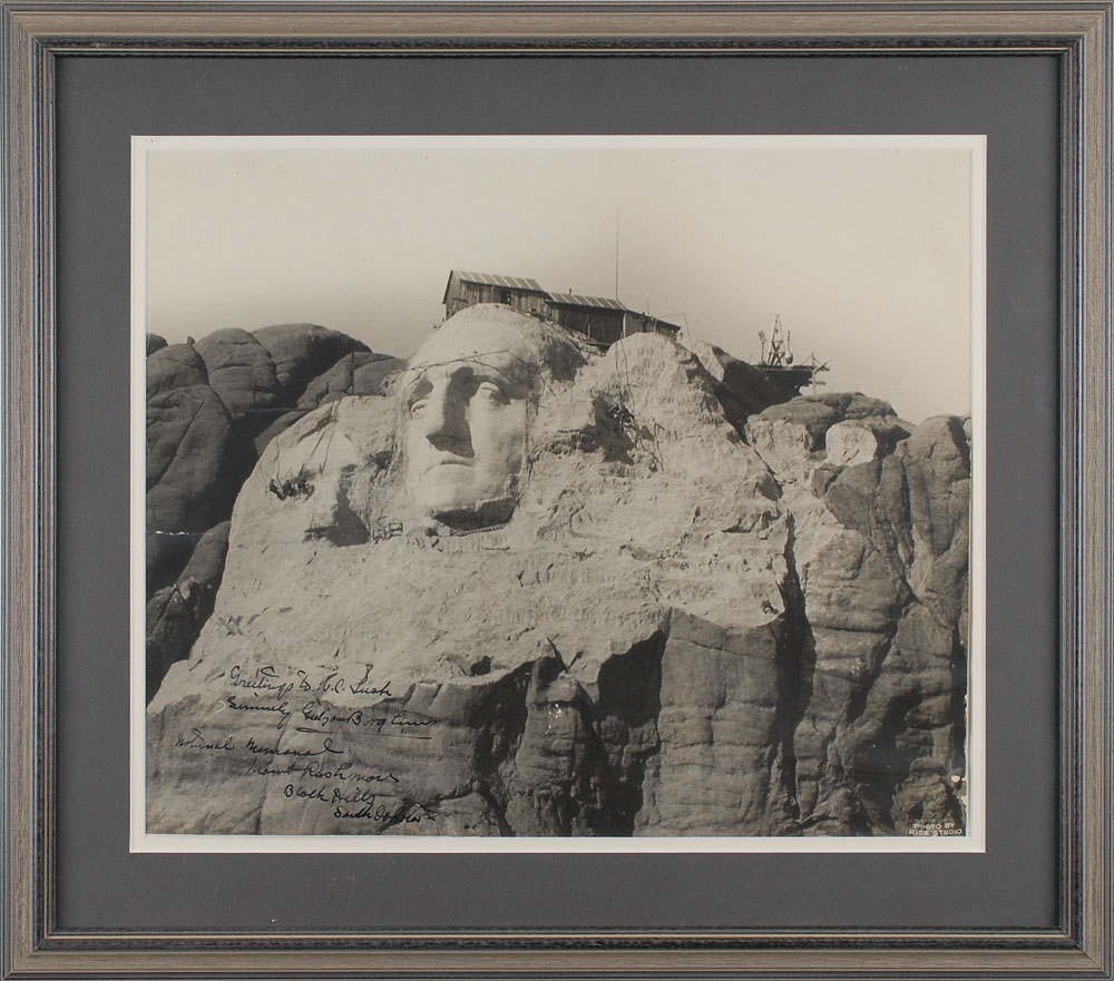 Fantastic matte-finish 16 x 13 photo of Mount Rushmore under construction as George Washington’s face is completed, signed and inscribed in fountain pen, “Greetings to W. C. Lusk, Sincerely, Gutzon Borglum. National Memorial, Mount Rushmore, Black Hills, South Dakota.” Double-matted and framed to an overall size of 22 x 19. In very good condition, with a tear to the left edge, scattered creases, and a few specks of surface loss. W. C. Lusk was a newspaperman who owned the Yankton Press and Dakotan. An appropriately large photograph of the immense sculpture in progress. Pre-certified PSA/DNA.