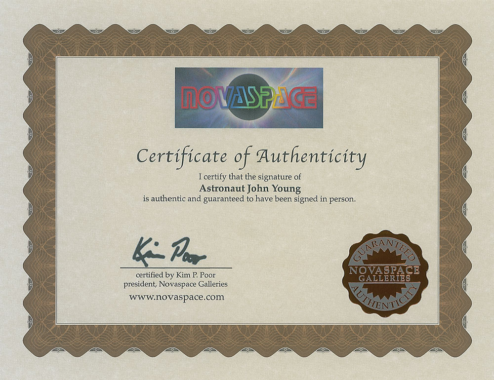 Magnificent color satin-finish 10 x 8 photo of Young jumping off the lunar surface and saluting the American flag, signed in silver ink, “John Young, Apollo 16 CDR.” In very fine condition. Accompanied by a certificate of authenticity from Novaspace. Pre-certified Zarelli Space Authentication.