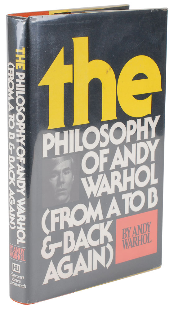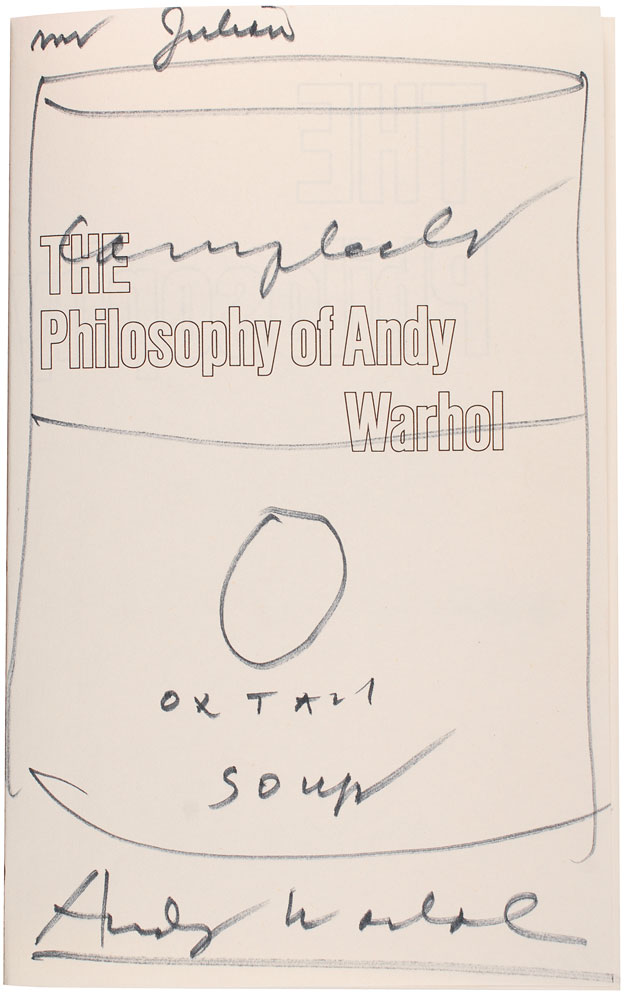 Signed book: The Philosophy of Andy Warhol. First edition, later printing. NY: Harcourt Brace, 1975. Hardcover with dust jacket, 5.75 x 8.5, 241 pages. Signed and inscribed on the half-title page in black felt tip, “Mr Julian, Andy Warhol,” filling the majority of the page with a large sketch of his iconic soup can, labeled “Campbell’s Oxtail Soup.” Autographic condition: fine. Book condition: VG+/VG+.