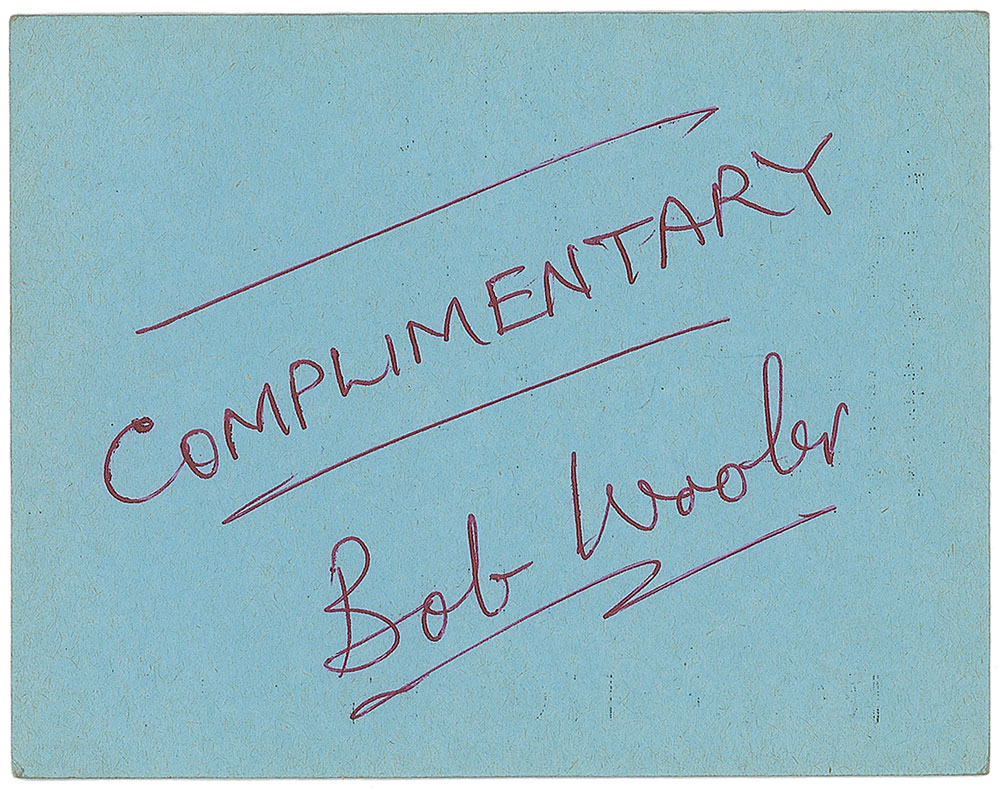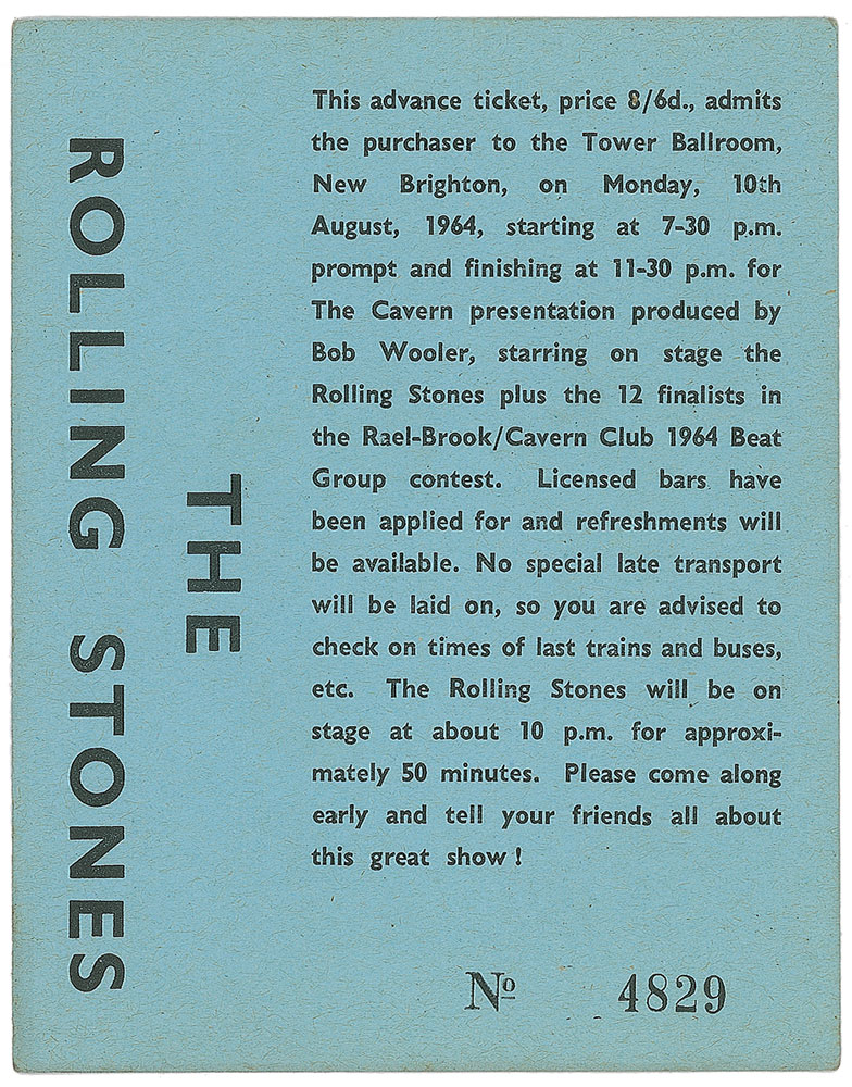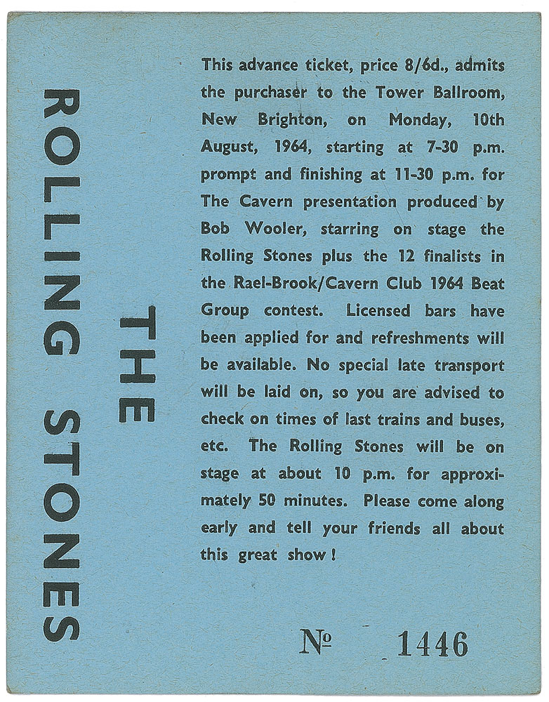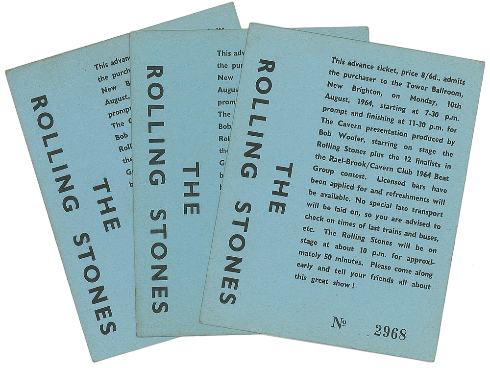 Set of three tickets to a Rolling Stones performance, 3.5 x 4.5, held at New Brighton’s Tower Ballroom on August 10, 1964. Each ticket is individually numbered, “1446,” “2968,” and “4829.” The reverse of one ticket is signed in black ballpoint by Bob Wooler, the former Cavern Club compere and a significant figure in the Merseybeat music scene. In overall fine condition, with slight toning to edges. Accompanied by a certificate of authenticity from Tracks.