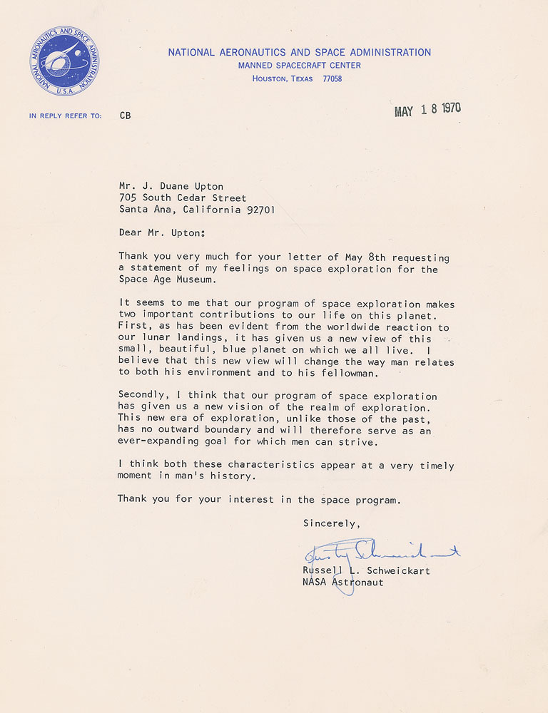 TLS, one page, 8 x 10.5, NASA Manned Spacecraft Center letterhead, May 18, 1970. Letter to Mr. J. Duane Upton. In part: “It seems to me that our program of space exploration makes two important contributions to our life on this planet. First, as has been evident from the worldwide reaction to our lunar landings, it has given us a new view of this small, beautiful, blue planet on which we all live.” In fine condition. Pre-certified Zarelli Space Authentication.