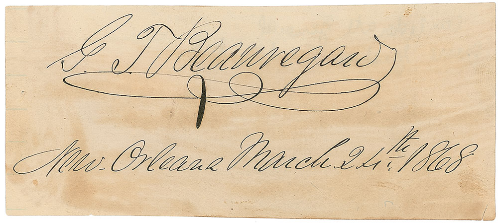 Ink signature, “G. T. Beauregard, New Orleans, March 24th, 1868,” on an off-white 4.75 x 2 clipped slip. Toning from adhesive to reverse, otherwise fine condition. Pre-certified PSA/DNA.