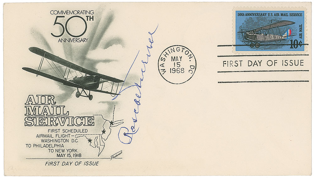 American aviator (1895–1970) who set the east-to-west transcontinental speed record in 1930. FDC with a cachet honoring the 50th anniversary of airmail service, signed in blue ballpoint. In fine condition. Pre-certified PSA/DNA.