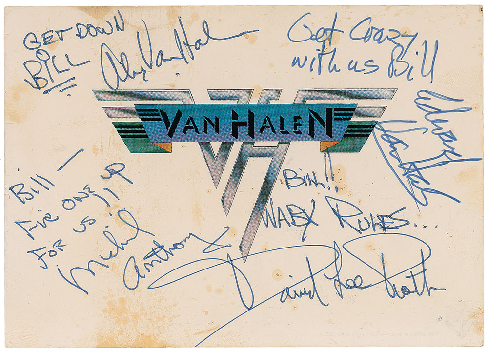 Color postcard bearing the original Van Halen logo, 7x 5, signed and inscribed in blue ballpoint, “Get down Bill, Alex Van Halen,” “Bill—Fire one up for us!! Michael Anthony,” “Bill!! WABX rules…David Lee Roth,” and in blue ink, “Get crazy with us Bill, Edward Van Halen.” In very good condition, with scattered soiling and a slight crease to top edge. Pre-certified REAL.
