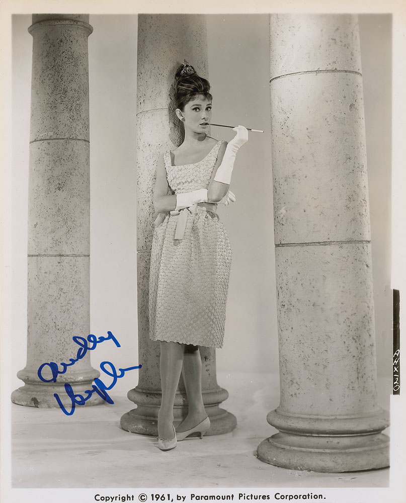 Gorgeous glossy 8 x 9.75 Paramount Pictures publicity photo of Hepburn from the 1961 film Breakfast at Tiffany’s, signed in blue felt tip. In fine condition. A beautiful image of Hepburn in her most iconic role. Pre-certified PSA/DNA.