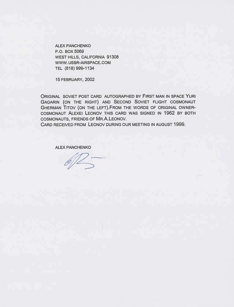 Exceptional color postcard of Yuri Gagarin and Gherman Titov in uniform and reading a newspaper on a park bench, 5.75 x 4, signed in blue ink by Titov and in black ink by Gagarin. In fine condition, with a small, unobtrusive tear to bottom edge and slight brushing to the Gagarin signature. Accompanied by a letter of provenance from collector Alex Panchenko, who includes two printed images of himself posing with original postcard owner and cosmonaut Alexei Leonov. Signed in 1962 by the national heroes of Vostok 1 and 2, this vibrantly colored postcard is strengthened by its impeccable provenance and the uncommon pairing of Gagarin, the first man in space, and Titov, the youngest man in space. Pre-certified Zarelli Space Authentication.