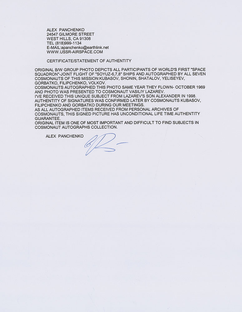 Rare glossy 9.5 x 7.25 group photo of the crew members that comprised the Soyuz 6, 7, and 8 missions, signed in the lower border in various colored ink by Georgi Shonin, Valeri Kubasov, Anatoly Filipchenko, Vladislav Volkov, Viktor Gorbatko, Vladimir Shatalov, and Aleksei Yeliseyev. In fine condition, with some light creasing to corners and top edge. Accompanied by a letter of provenance from collector Alex Panchenko, in part [grammar retained]: “Cosmonauts autographed this photo same year they flown—October 1969—and photo was presented to cosmonaut Vasiliy Lazarev. I’ve received this unique subject from Lazarev’s son Alexander in 1998. Authenticity of signatures was confirmed later by cosmonauts Kubasov, Filipchenko and Gorbatko during our meetings.” Panchenko also includes printed images of himself posing with numerous other cosmonaut legends. Augmented by its exceptional provenance, this uncommon, fully signed photograph boldly features the three Soyuz crews that had endeavored to perform the most ambitious docking and crew transferal in space exploration history. Pre-certified Zarelli Space Authentication.