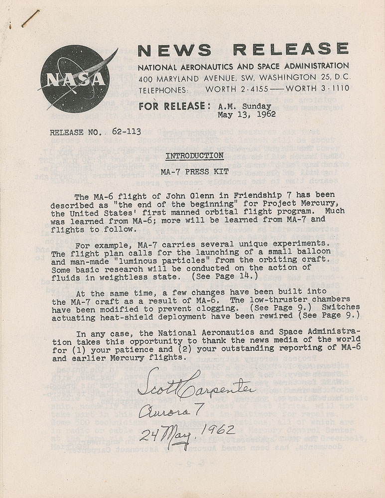 Two items: an original NASA MA-7 news release packet, 23 pages, 8 x 10.5, May 13, 1962, signed later on the front in black ballpoint, “Scott Carpenter, Aurora 7, 24 May 1962”; and a color satin-finish 8 x 10 photo of Carpenter in formal attire, signed in black felt tip. In overall fine condition. Pre-certified Zarelli Space Authentication.
