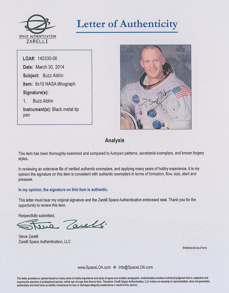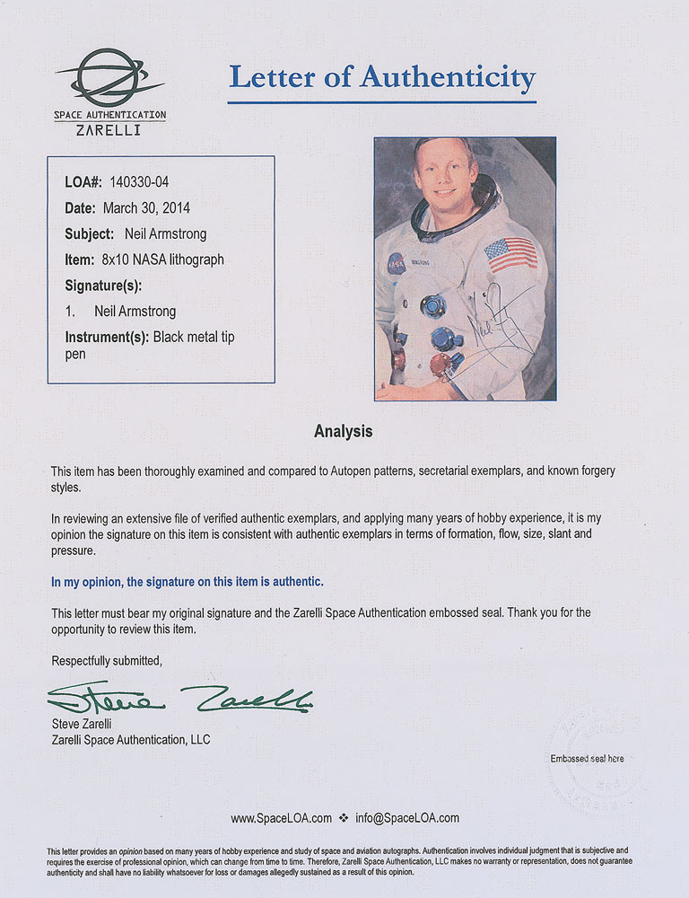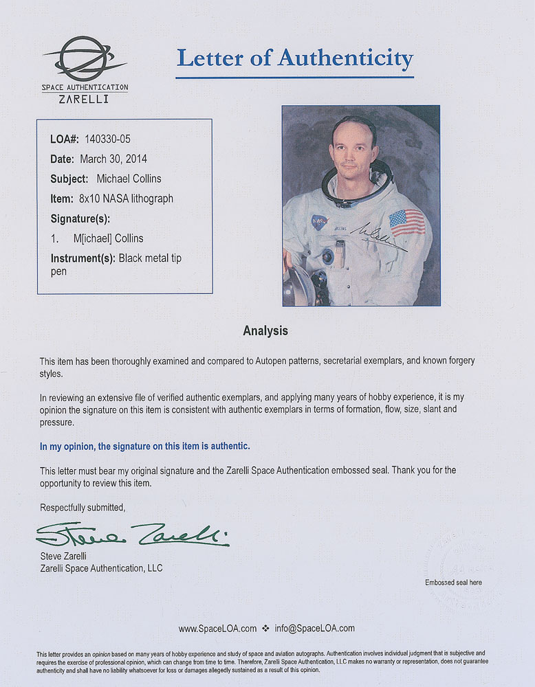 Exceptional complete set of three official color 8 x 10 NASA lithographs of Neil Armstrong, Buzz Aldrin, and Michael Collins shown individually in their white space suits, each signed in black felt tip by the astronaut pictured. In overall fine to very fine condition, with a trivial crease to the extreme corner tip and mild paperclip impression to the upper left of the Armstrong lithograph, both hardly noticeable and not affecting the superb appearance. Accompanied by full letters of authenticity from Zarelli Space Authentication for all three. With all signed in black felt tip in the same general area, the uniformity of these uninscribed Apollo 11 white space suit lithographs sets them apart from those typically offered. Pre-certified Zarelli Space Authentication.