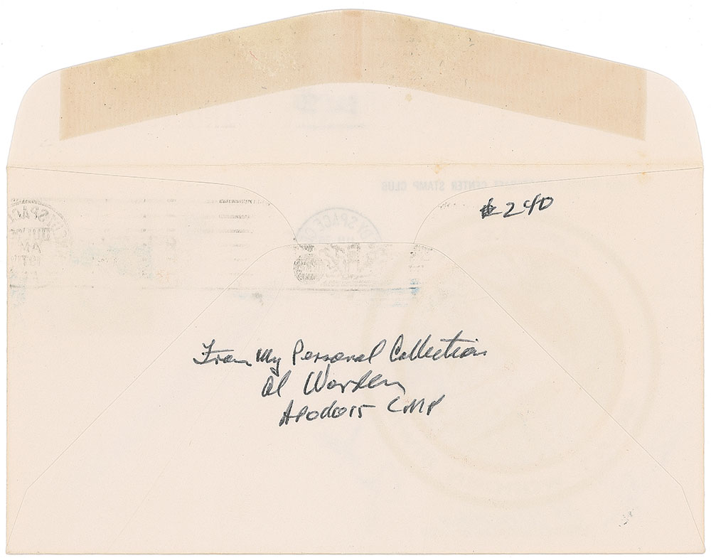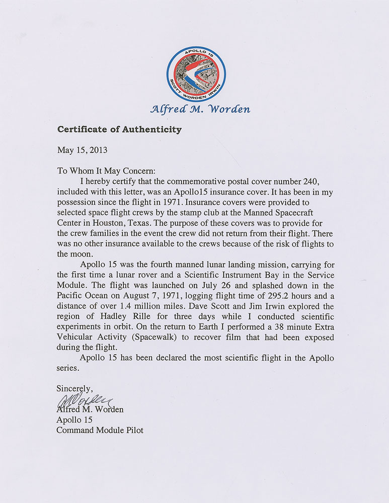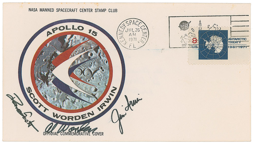 Apollo 15 insurance cover with a cachet of the mission insignia, signed in black felt tip by Dave Scott, Al Worden, and Jim Irwin. Also signed on the reverse of the flap in black ballpoint, “From my personal collection. Al Worden, Apollo 15 CMP,” and numbered “#240.” In fine condition. Accompanied by a detailed letter of provenance signed by Worden, in part: “I hereby certify that the commemorative postal cover number 240…was an Apollo 15 insurance cover. It has been in my possession since the flight in 1971.” Pre-certified Zarelli Space Authentication.