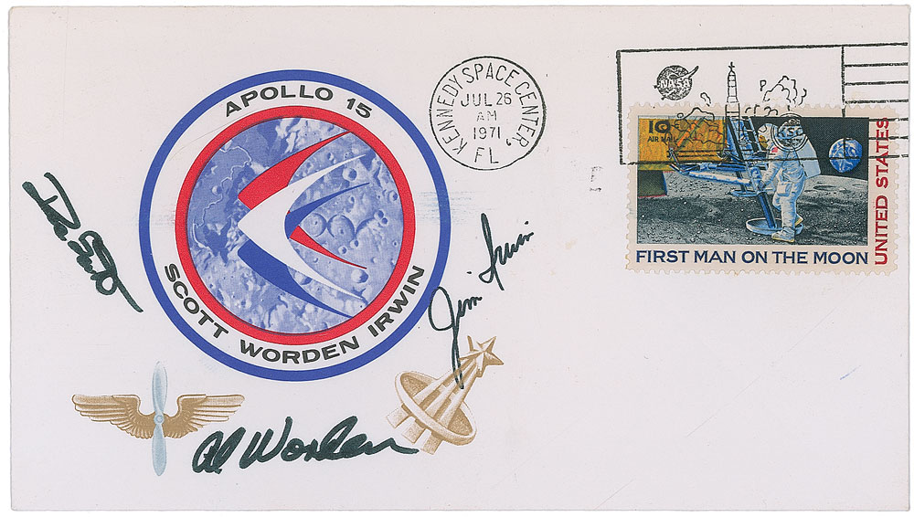 Apollo 15 launch day postal cover with a cachet of the mission insignia, signed in black felt tip by Dave Scott, James McDivitt, and Al Worden. In fine condition. Pre-certified Zarelli Space Authentication.