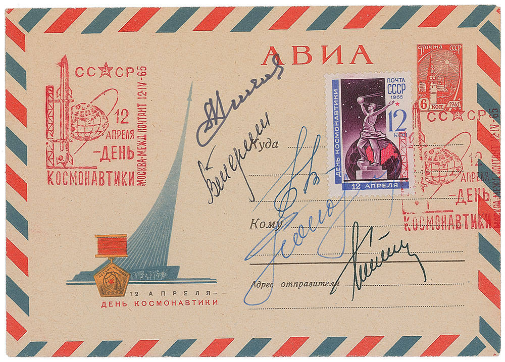 Soviet commemorative cover with a cachet honoring ‘Cosmonautics Day’ in 1965, signed in ink and ballpoint by Titov, Nikolayev, Popovich, Bykovsky, and Tereshkova. In fine condition. Pre-certified Zarelli Space Authentication.