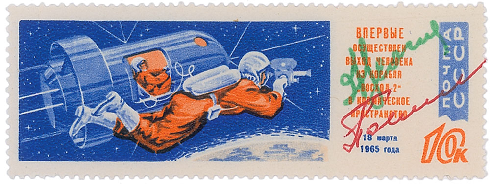 Soviet postage stamp commemorating the Voskhod 2 flight on March 18, 1965, signed in red and green ink by Pavel Belyayev and Alexei Leonov. In fine condition. Pre-certified Zarelli Space Authentication.