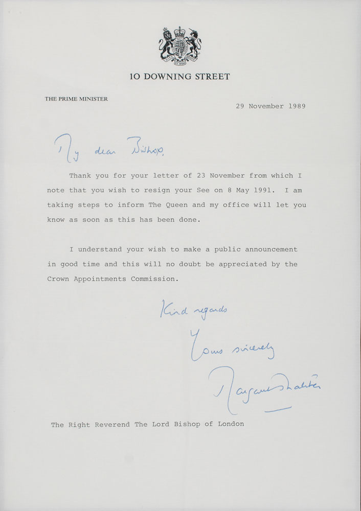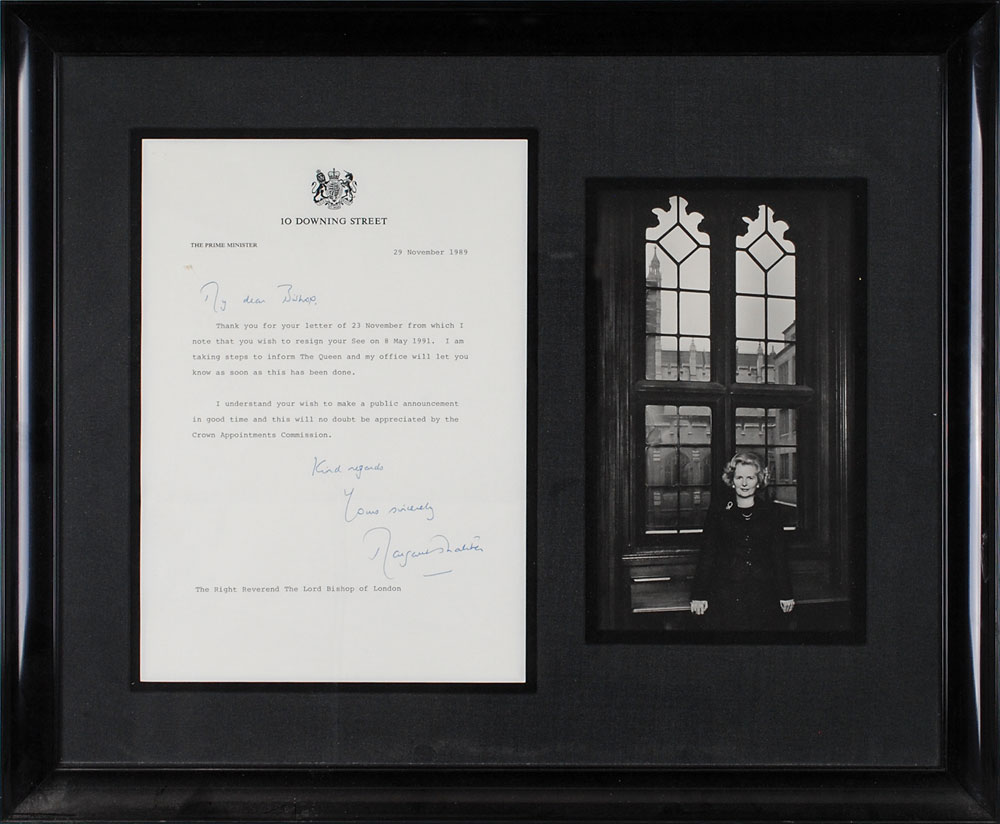 TLS, one page, 8 x 11.5, prime minister letterhead, November 29, 1989. Letter to “The Right Reverend The Lord Bishop of London.” In full: “Thank you for your letter of 23 November from which I note that you wish to resign your See on 8 May 1991. I am taking steps to inform The Queen and my office will let you know as soon as this has been done. I understand your wish to make a public announcement in good time and this will no doubt be appreciated by the Crown Appointments Commission.” Attractively double-cloth-matted and framed with a portrait of Thatcher to an overall size of 21 x 17.5. In fine condition, with intersecting folds. The recipient of this letter, Graham Leonard, was a bishop of the Church of England but resigned and became a Roman Catholic, becoming the most senior Anglican cleric to do so since the English Reformation. Pre-certified PSA/DNA.