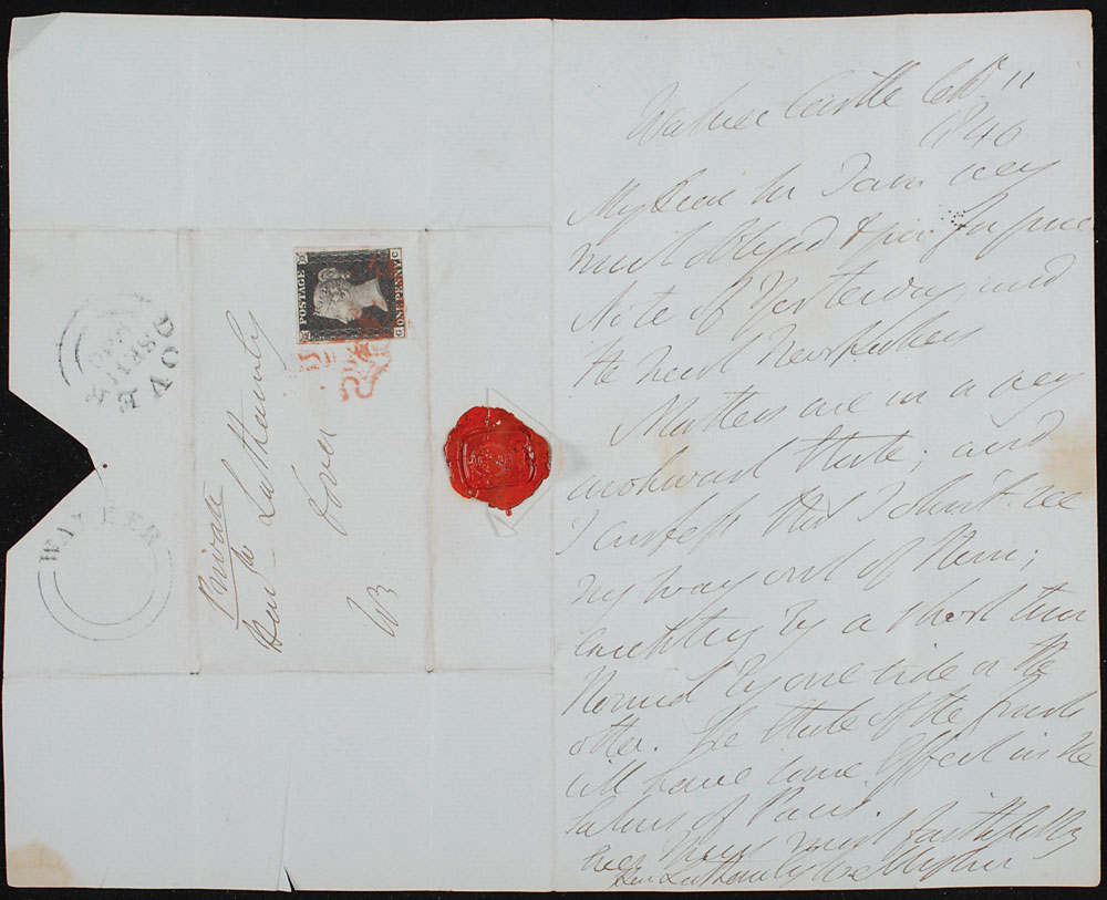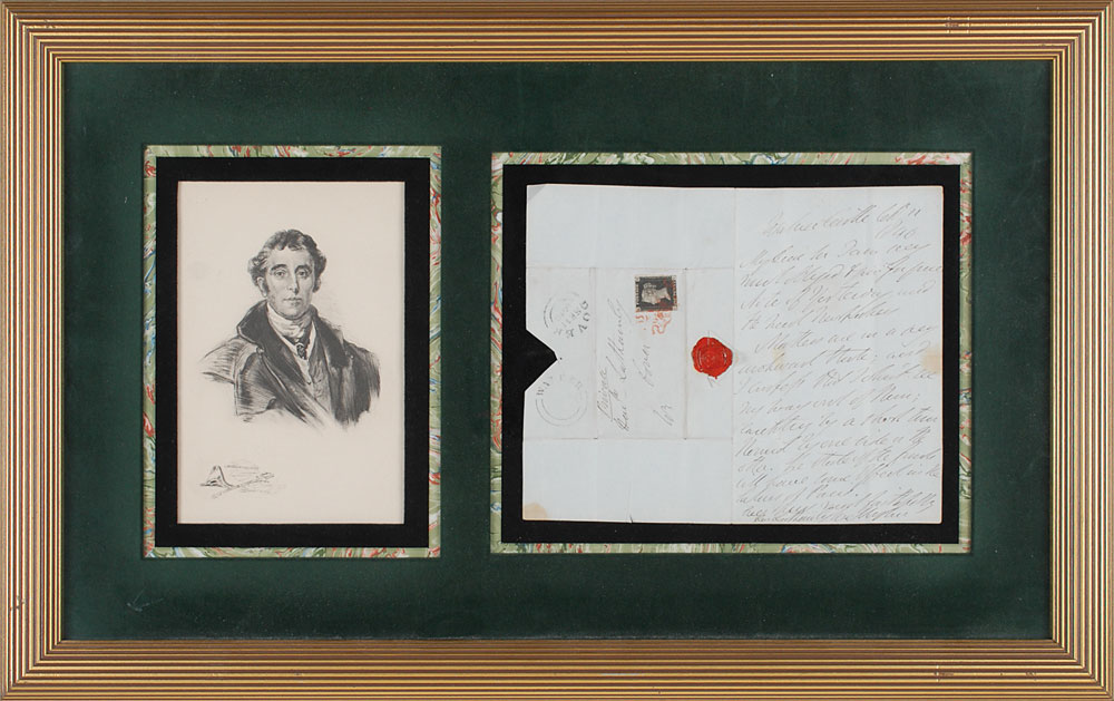 ALS signed “Wellington,” one page, 4.5 x 7.25, September 11, 1846. Letter to a gentleman. In part: “Matters are in a very awkward state; and I don’t see my way out of there.” Also addressed on the reverse of the second integral page in Wellington’s hand, initialed “W” in the lower left corner. Attractively double-suede-matted and framed unfolded beside a handsome portrait to an overall size of 24.5 x 15.25. In fine condition, with intersecting folds (one vertical fold passing through a single letter of the signature) and a few areas of toning. Pre-certified PSA/DNA.
