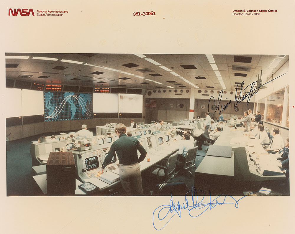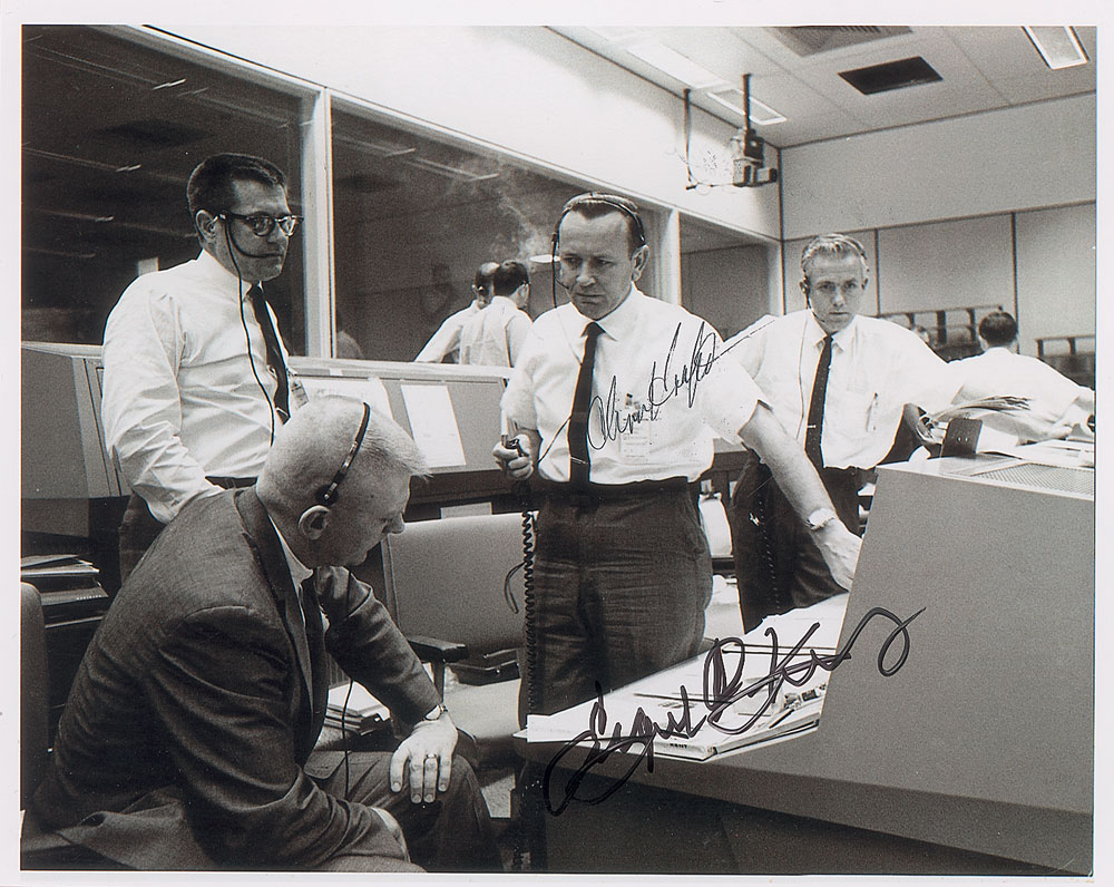 Two signed photos: an official color semi-glossy 10 x 8 ‘red-numbered’ NASA photo of Mission Control, signed in blue ballpoint by Gene Kranz and in black ink by Chris Kraft; and a glossy 10.5 x 8.5 photo of Kranz and Kraft together, signed in black felt tip by both. In overall fine condition, with slight brushing to one of Kraft’s signatures and toning to the ‘red-numbered’ photo. The Leon Ford Collection. Pre-certified Zarelli Space Authentication.