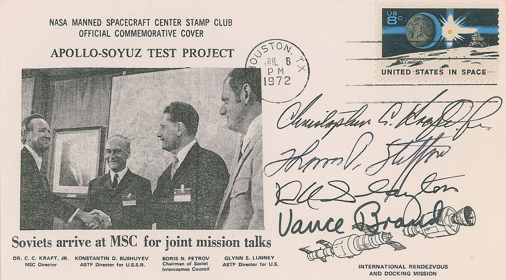 Two covers: a commemorative cover with a cachet honoring the Apollo-Soyuz Test Project, signed in black felt tip and ballpoint by Tom Stafford, Vance Brand, Deke Slayton, and Chris Kraft; and an FDC with a cachet honoring the mission, signed in black felt tip and ballpoint by Tom Stafford, Vance Brand, and Deke Slayton. In overall fine condition. The Leon Ford Collection. Pre-certified Zarelli Space Authentication.