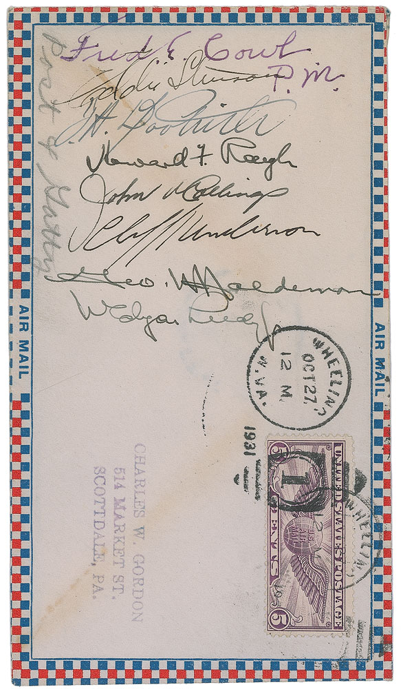 Airmail cover postmarked at Wheeling, West Virginia, on October 27, 1931, signed in fountain pen by James H. Doolittle, Postmaster Fred E. Cowl, aircraft manufacturer Edward Stinson, Lieutenant Howard F. Rough, John Collings, George W. Haldeman, and two others. A pencil notation also indicates that Post and Gatty were there. Light bands of toning from envelope adhesive, otherwise fine condition.