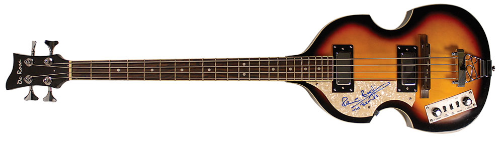 Attractive left-handed sunburst-finish De Rosa ‘violin’ bass guitar, signed on the pearloid pickguard in blue felt tip, “Pete Best, The Beatles.” In fine condition. Oversized. Pre-certified REAL.