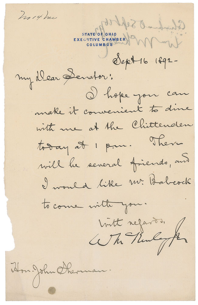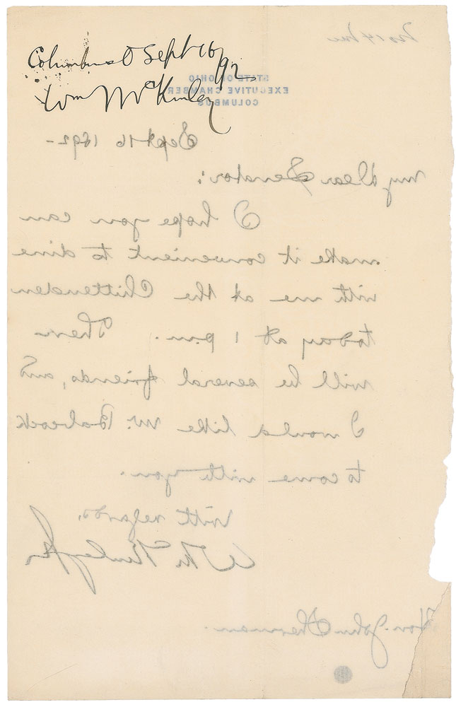 LS signed “W. McKinley, Jr.,” one page, 5.5 x 8.75, State of Ohio Executive Chamber letterhead, September 16, 1892. Letter to Senator John Sherman. In full: “I hope you can make it convenient to dine with me at the Chittenden today at 1 p.m. There will be several friends, and I would like Mr. Babcock to come with you.” In fine condition, with intersecting folds, a small stain and paper loss to the left edge, and show-through at the top from docketing to reverse. Earlier in the summer McKinley had lost the Republican presidential nomination to Benjamin Harrison but would receive the nomination four years later. Sherman had already run for the Republican nomination three times, coming closest to winning in 1888. Once McKinley was finally successful in securing the presidency, he awarded his friend Sherman with the position of secretary of state. Pre-certified PSA/DNA.