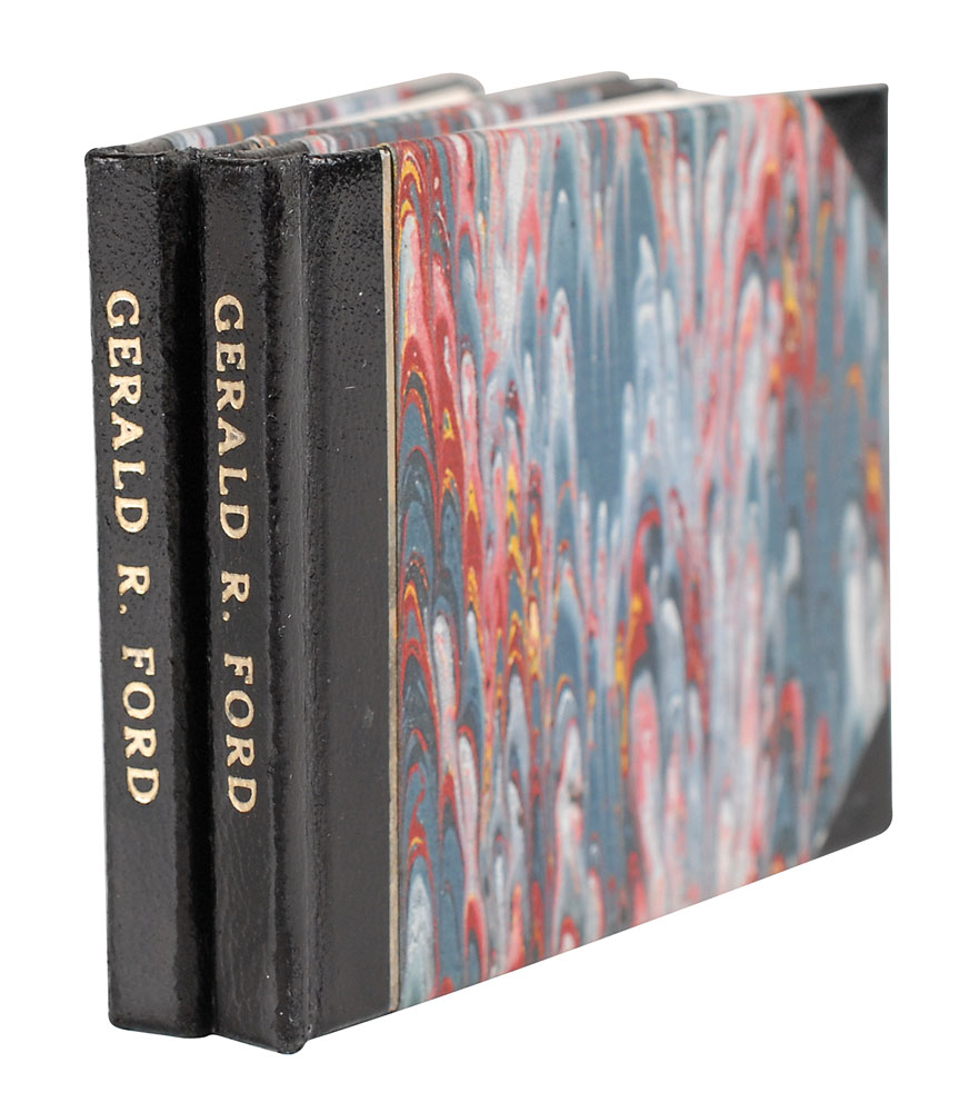 Two special copies of the miniature book The Tenth Convention, hardcovers, measuring only 2.75 x 2, 26 pages. Each is a limited first edition; one reads “President’s copy,” the other, “George Bush’s copy.” Northridge, CA: Lord John Press, 1988. Both are signed on the title page in blue ink, “Gerald R. Ford.” In overall very fine condition. From the collection of noted publisher and founder of Lord John Press, Herb Yellin. Pre-certified PSA/DNA.
