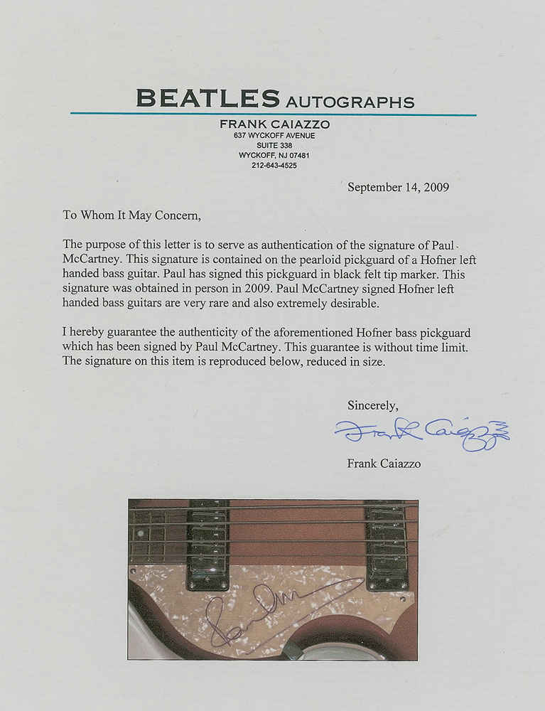 Gorgeous left-handed sunburst-finish Hofner ‘violin’ or ‘Cavern’ B-Bass HI-Series bass guitar, beautifully signed on the pearloid pickguard in black felt tip. In fine condition. Accompanied by a letter of authenticity from noted Beatles expert Frank Caiazzo, in which he writes, “This signature was obtained in person in 2009. Paul McCartney signed Hofner left handed bass guitars are very rare and also extremely desirable.” Originally designed by Walter Hofner in 1955, the beautifully shaped ‘Beatle bass’ remains a highly sought-after piece of musical equipment, and this very instrument, signed by one of the world’s most influential four-stringers, is no exception. Pre-certified REAL.