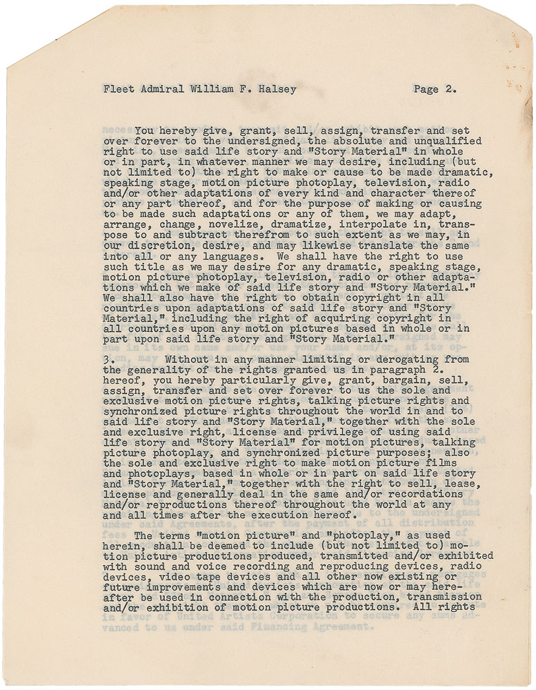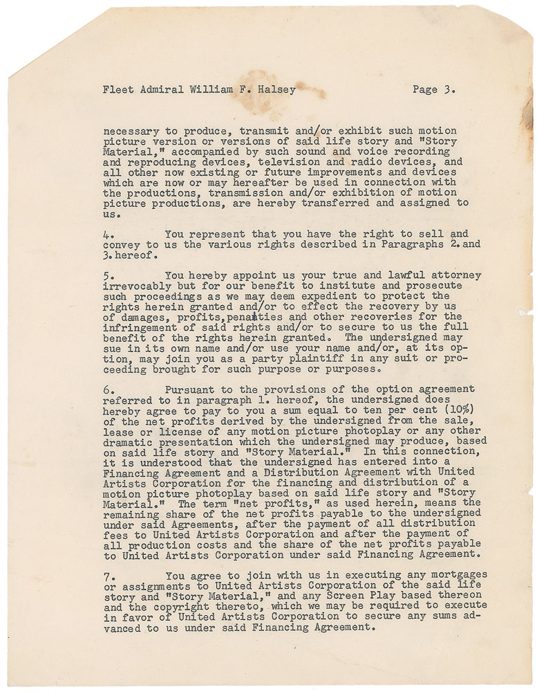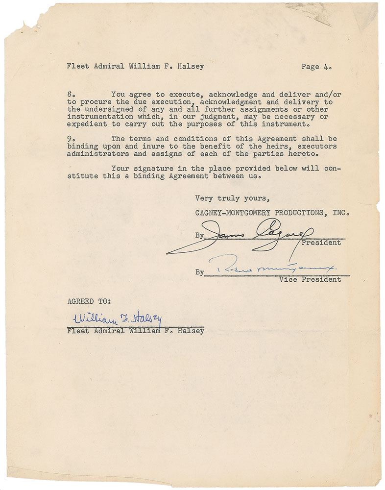 DS, four pages, 8.5 x 11, April 25, 1958. An agreement in which Fleet Admiral William F. Halsey transfers the “worldwide dramatic rights to your life story” to the actors James Cagney and Robert Montgomery. Signed at the conclusion in blue ballpoint by Halsey and Montgomery, and in fountain pen by Cagney. Expected document wear with creases and small tears to edges, the signed page detached with paper loss to the upper left corner, and scattered soiling, otherwise fine condition. Accompanied by an unsigned matte-finish photo of Halsey and Cagney together. This agreement resulted in the 1960 docudrama chronicling Halsey’s efforts in fighting against Admiral Isoroku Yamamoto and the Imperial Japanese Navy in the Guadalcanal campaign of World War II. Directed and narrated by Montgomery, the film starred Cagney as the revered admiral. Pre-certified PSA/DNA.