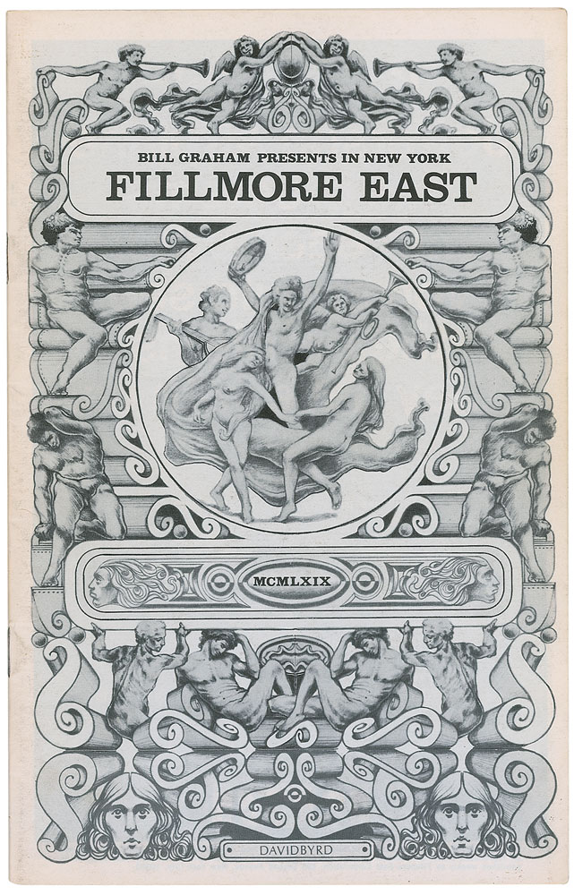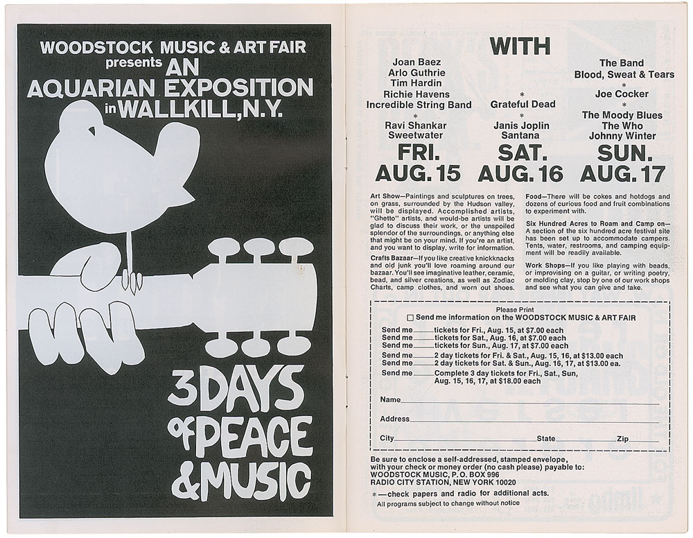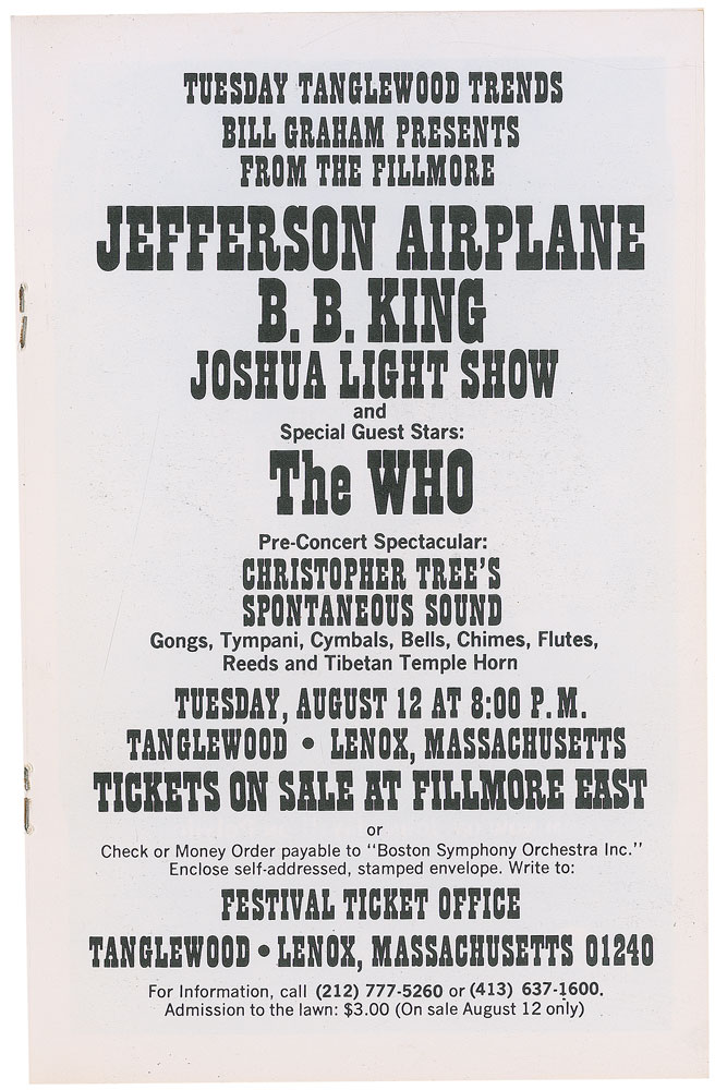Fillmore East program, 5.5 x 8.5, promoting various concerts held in 1969, including: the Woodstock Music & Art Fair held in Wallkill, New York on August 15–17 (ticket order form intact), featuring artists like the Grateful Dead, Janis Joplin, and Joe Cocker; and a special guest performance by The Who at Tanglewood in Lenox, Massachusetts on August 12, featuring other acts like Jefferson Airplane and B. B. King. In fine condition.